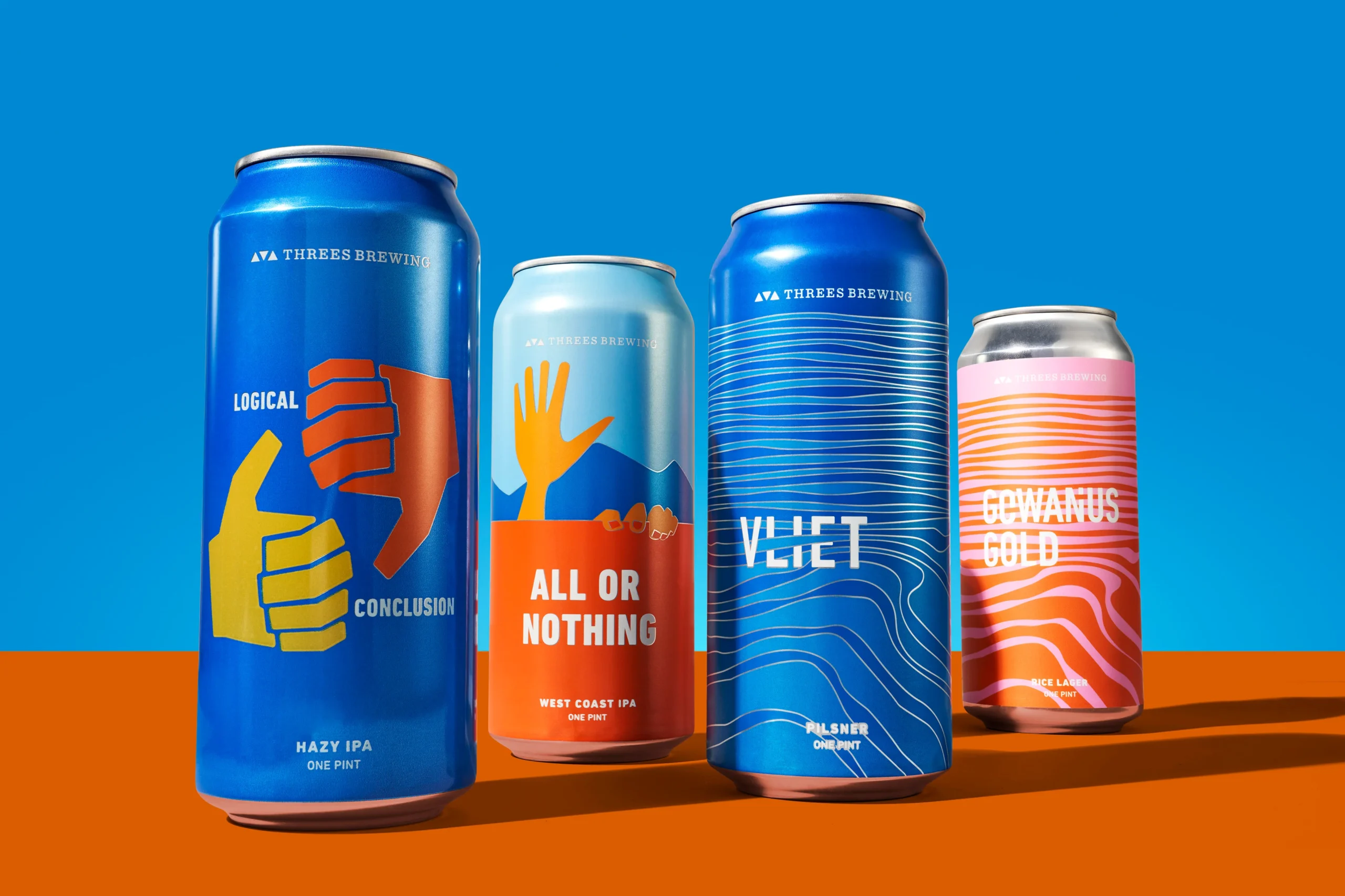 Assortment of Threes Brewing craft beer cans with bold designs in Gowanus, Brooklyn